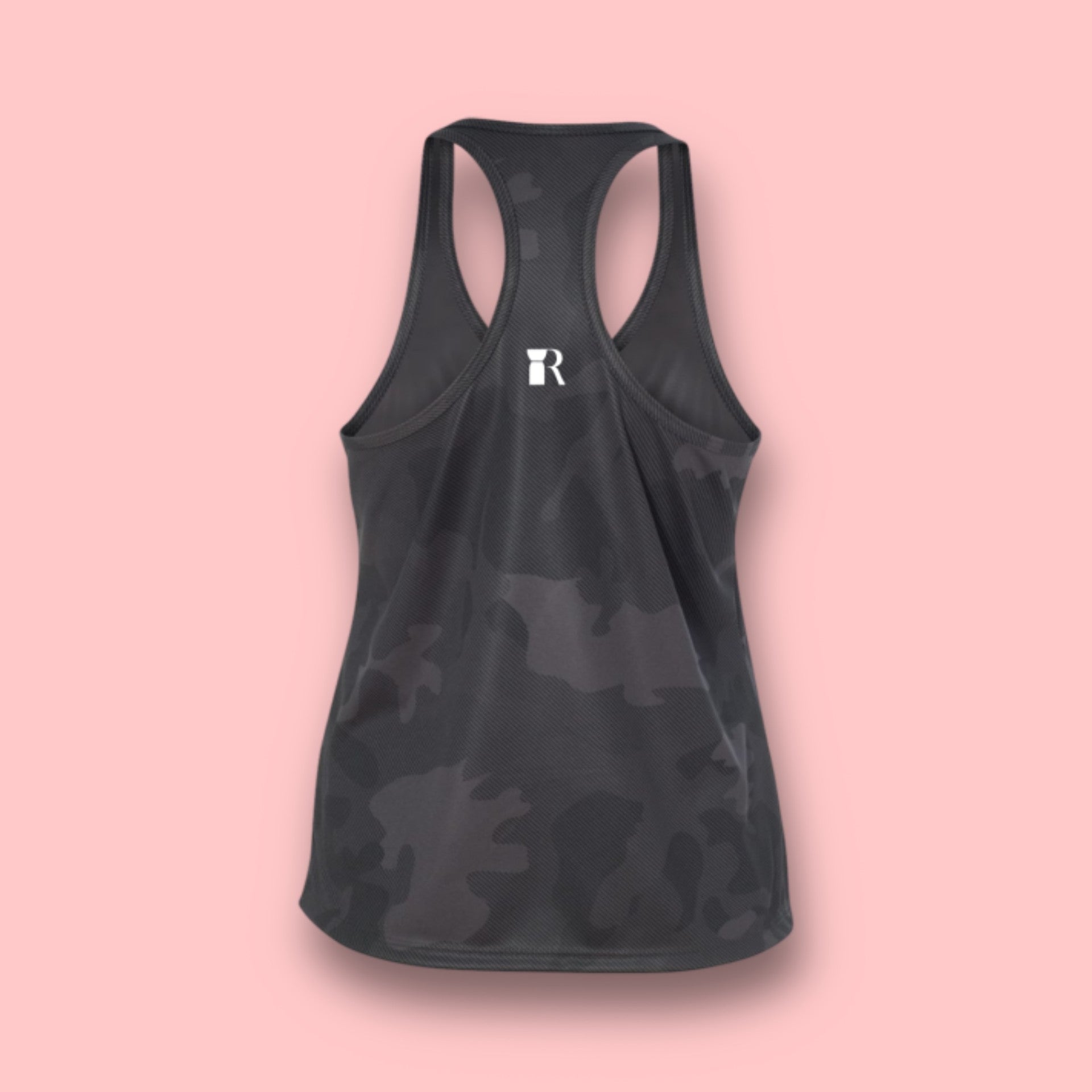 Features a sleek racer back design, longer body length, and a curved bottom hem for a flattering fit.